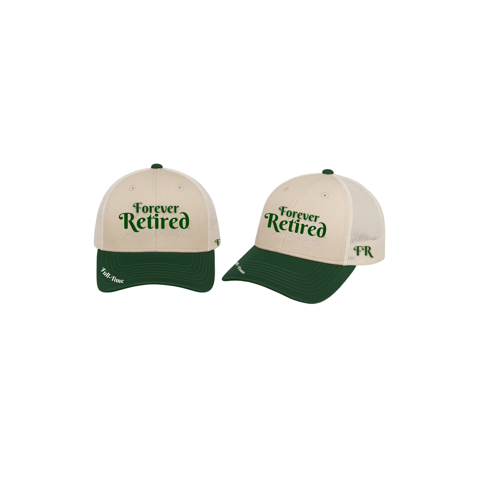 Material: Cotton front with mesh backing Fit: One size fits most with adjustable strap Feel: Lightweight, breathable, and comfortable Style: Classic trucker hat with modern Forever Retired design